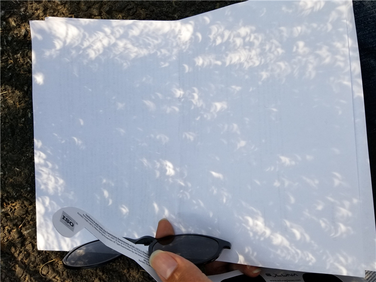图四、太阳的针孔成像影像。叶子中的缝隙就像是针孔相机一样,把太阳的影像投射在地面上。平常这些影像是圆形的,日蚀发生的时候,这些影像变成弯月形。