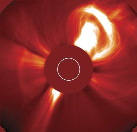 以高达每秒2千公里(1200英里)的速度快速穿越太阳系,日冕大量喷出是磁通的强烈喷发和来自太阳表面的活跃点爆发的带电气体。