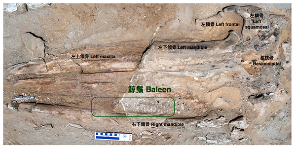 图三:于秘鲁出土的皮斯科须鲸化石 (头颅部分,腹面朝上)。鲸须化石的位置以绿线框标示。