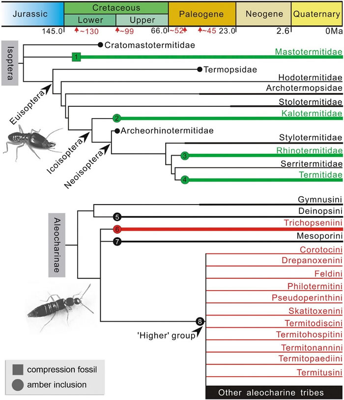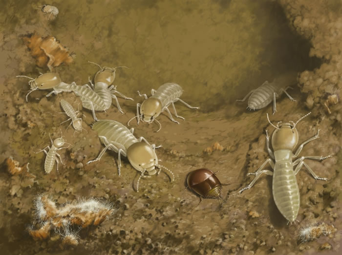 据中国科学院南京地质古生物研究所:自然界中社会性昆虫(如蚂蚁、白蚁和蜜蜂)与其他动物之间存在十分密切的关系.昆虫之间互相利用,从而使得一方或双方得以更好地利用资源、获得保护、适应环境和占领新的生境。白蚁是目前已知最为古老的社会性昆虫,其社会性起源于侏罗纪晚期,显著早于其他社会性昆虫。白蚁巢穴中也常寄居有种类多样、形态特化的小型动物(主要为昆虫),有些离开蚁巢则无法生存,它们被称之为螱((wèi))客(Termitophiles),这种现象可称为社会性寄生。通过长期而复杂的演化适应,螱客能够侵入隐蔽的白蚁巢穴,利用巢穴内适宜稳定的环境、丰富营养的食物,并能获得蚁穴这一天然屏障的有效保护。螱客生活在较为封闭的白蚁巢穴中,化石记录极其稀少。