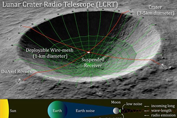 这个想法是获得美国宇航局(NASA)创新先进理念(NIAC)基金的23个项目之一,计划在月球背面的一个撞击坑内,利用机器人搭建一张金属网,并悬置一个信号接收器,建成一个天文望远镜。