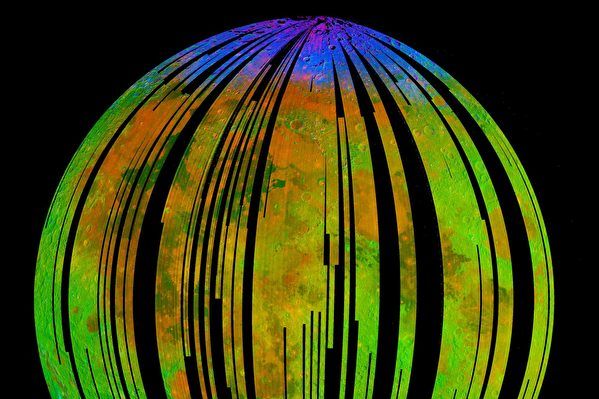 科学家通过分析月球反射来自太阳的近红外辐射而形成的不同颜色,来推断月球上的物质元素。图中两极附近的蓝色显示那里有少量水分子和羟基类分子,红色区域含有铁元素的物质。(NASA/JPL/Northwestern University)