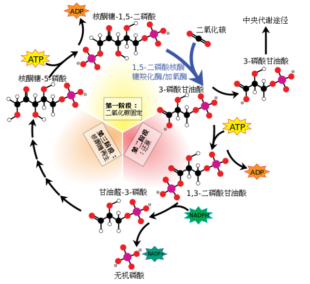 在卡尔文循环中,充当“接受者”的1,5-二磷酸核酮糖(Ribulose-1,5-disphosphate,RuBP)。由于接受二氧化碳是一个羧化过程,催化这一步反应的酶被称为RuBP羧化酶(RuBisCO)——作为二氧化碳固定中最为关键的酶之一,RuBisCO实际上是地球上总量最大的一种蛋白质。