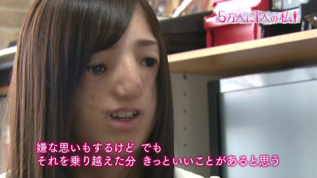 山川记代香来自日本爱知县,自幼饱受无脸症之苦,目前在东海市政府工作,日前她参与了电视台的纪录片拍摄,记录了她艰辛的成长历程。罹患无脸症的患者,通常会有结构异常的外耳、听力丧失、下眼睑缺损、非常小的下巴、颔骨位置异常、特别大的嘴、颚裂、大拇指异常小或缺损、构音问题等多重障碍。