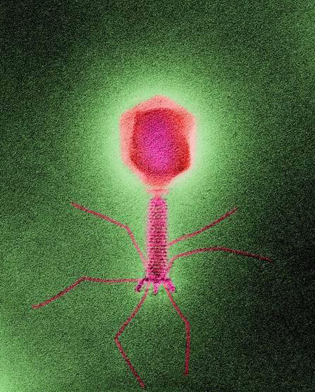 噬菌体:如图所示,这张彩色电子显微图像呈现的是一种噬菌体,它能够攻击威胁人类健康的其它细菌,通常人们很难想像微生物的真实模样,事实上它们的外形十分奇特,令人们大开眼界。