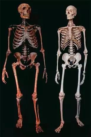 ?重构的尼安德特人骨架(左)与现代人骨架(右)。图片来源:美国自然历史博物馆
