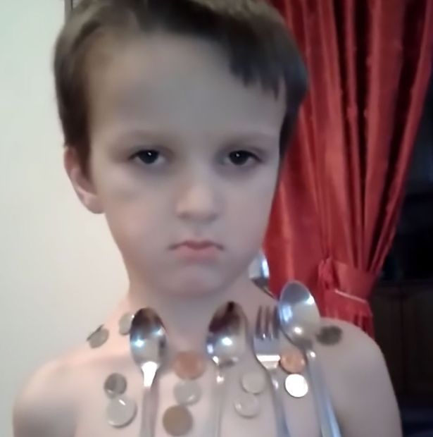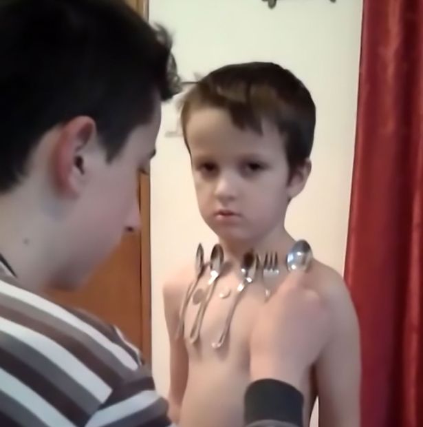 在这个惊人的影片中,餐具吸在小男孩的身上,他的胸部吸住了三支汤匙、一根刀子以及十三个硬币,背部甚至有更多。