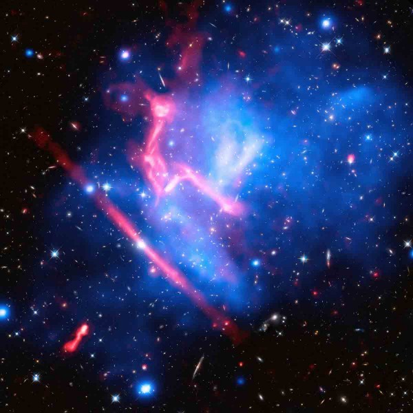 在NASA发表的最新照片中,我们得到对其中两个星系的不同波长的观察:MACS J0416.1-2403和MACS J0717.5+3745 (简称MACS J0416和MACS J0717)。这些照片使用哈伯光波望远镜、Chandra望远镜拍摄X射线辐射(蓝色),以及美国国家科学基金会(NSF)的Jansky超大电波阵列(粉红色)。这些照片显示出这些星系如何活耀地合并、互动,以及与热气体泛滥于星系间的太空。
