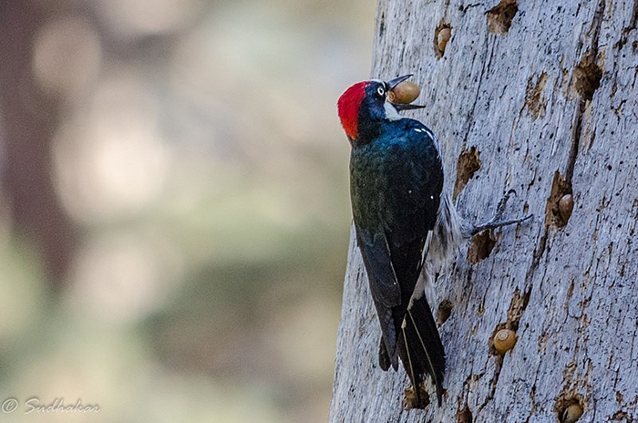 在北美沿海,会看到一整排打满密密麻麻孔洞的树木,这些满目疮痍的树干,都是“橡树啄木鸟”(Melanerpes formicivorus)的作品。橡树啄木鸟将搜集来的橡子一颗颗塞进孔洞中,成为它们的粮仓,准备过冬和繁殖。