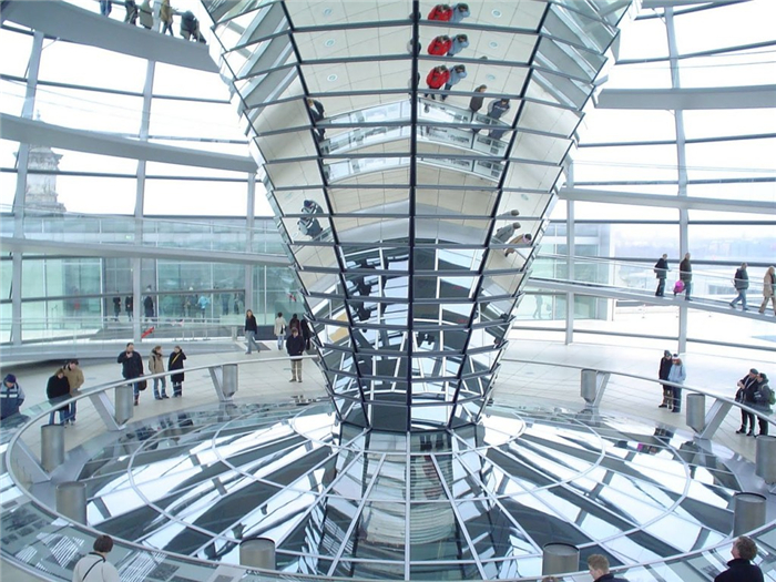 5.德国国会大厦的玻璃穹顶建筑在1933年德国国会大厦发生了“国会纵火案”,1945年在战争中大厦被炸掉圆顶,1991年,德国国会决定将联邦议会驻地迁往柏林,大厦重新被选定为德国国会的办公场所,1994年英国建筑师诺曼·弗斯特对它进行了重新修建,经过多次修改设计之后,最终设计出一个玻璃穹顶。正是每一次历史对建筑的再塑造,成就了我们今天看到的模样。