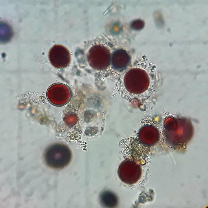 乌克兰国家科学院海洋生态学家佐托夫(Andrey Zotov)拍下现场景象,向世人揭开神秘南极的另一面目。乌克兰国家南极科学中心将照片上传脸书,“我们的科学家们已经在显微镜底下,辨识出是极地雪藻(Chlamydomonas nivalis)。”