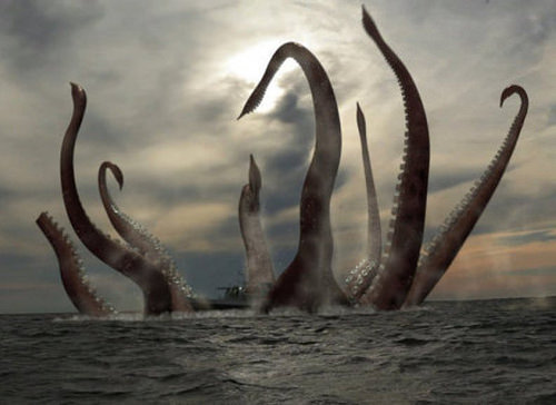 据说神话中的海怪(如图所示)是一种远古时有触手的怪物,它会吃鲸鱼并吞没船只。关于这个怪物的故事可追溯到12世纪的挪威。这些故事经常提到一个生物,它大得让人误以为它是一座岛。