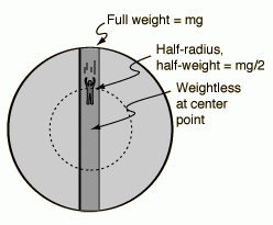 为什么会这样呢?HyperPhysics(专门分享物理相关主题的教育网站)解释:“一个有对称质量的球体,他物体的重力力量会来自他内部半径的质量,这作用会像是来自于中心的点。当仔细分析时,你会发现任何半径r的重力小于R地球的重力将与距离中心的距离成线性比例。”