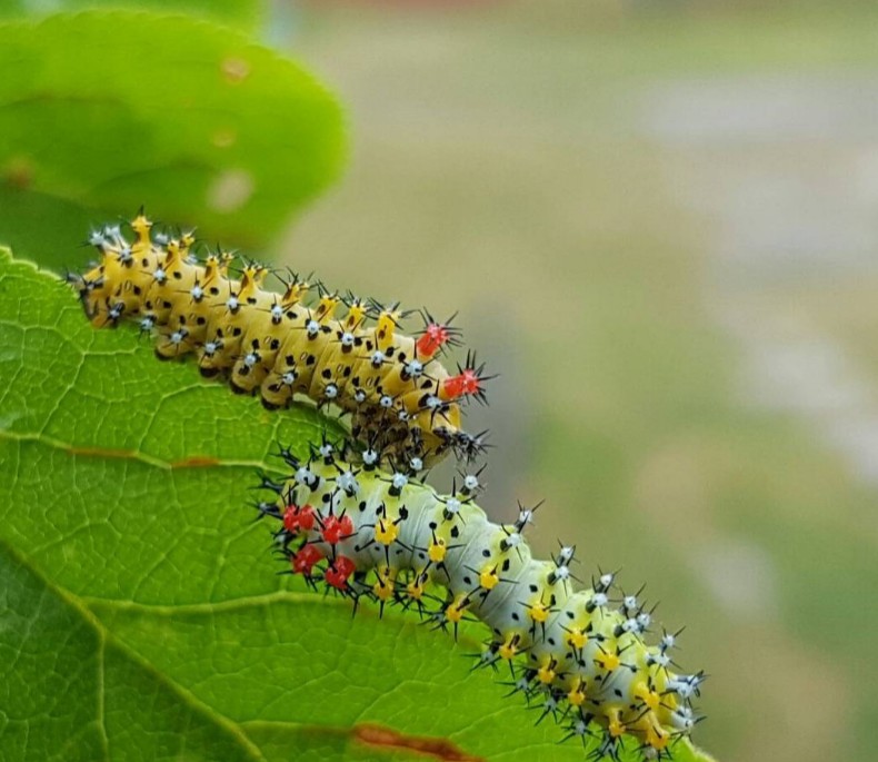 天蚕蛾(Hyalophora cecropia)幼虫。他是北美最大的夜行性蛾之一,翅膀展开可以达到6英寸 (~15厘米) ,而毛毛虫的身体大约是4.5英寸 (~11厘米) ,他们是昆虫界的巨人,主要以枫叶,桦树和樱桃树为食。