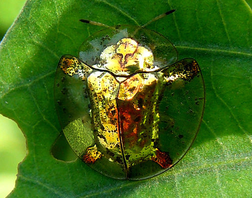 黄金龟甲虫(Charidotella sexpunctata)。金龟甲身上有金色的甲壳(有些有金红褐色与黑色斑点) ,他们主要以红薯叶为主食,主要栖息地分布在美洲地区。