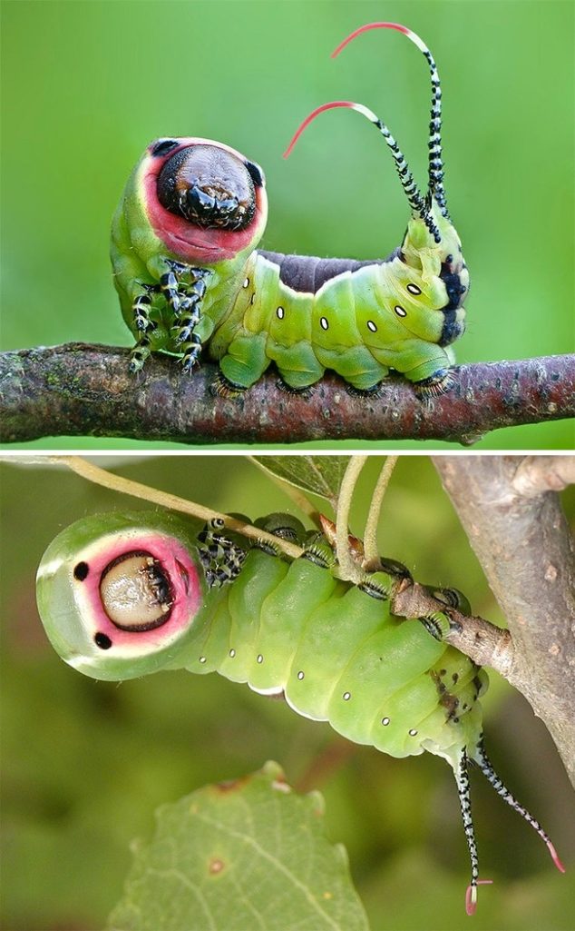 黑带二尾舟蛾(Dicranura vinula) 。这种蛾的毛毛虫很有趣,当他感觉到危险时,他的身体前端会抬起并变大,敌人就会看到一个张大的嘴巴,看起来十分吓人!这种毛毛虫可以在欧洲,俄罗斯,中亚和非洲找到。