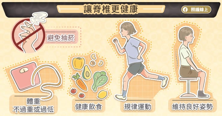 由于脊椎狭窄最常与年纪变大的退化老化相关,我们无法完全预防脊椎狭窄,但多保持健康体重、选择优质食物、避免抽烟、维持好的姿势、和定期运动还是可以让脊椎更健康,延缓脊椎退化造成狭窄及症状。
