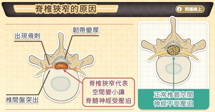 那为什么脊椎内的空间会太小呢?有部分患者是先天性的,本身在结构上脊椎椎管的空间就比较狭小,患者神经就容易受到压迫。然而,多数患者的症状来自于退化,包括骨头、韧带、和椎间盘都可能退化,这三者的退化都会让脊椎椎管的空间变得更小: