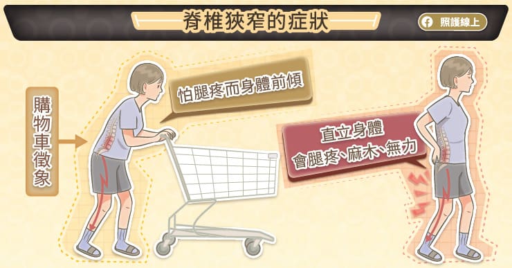 经典动作就是“购物车征象(shopping cart sign)”,意指长者习惯推着购物车时,为了怕腿疼,身体会不自觉地微微向前倾,无法直立身体。所以,假使你观察到家中长者会有走路前倾的模样,要注意可以带着长者就诊,看看是否脊椎的退化老化已经造成了脊椎狭窄的问题。除了身体前倾之外,脊椎狭窄的患者会觉得坐着的时候比较不痛、不麻,因此患者会愈来愈不想活动。