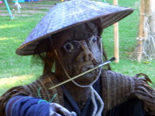一般稻草人顾名思义是用稻草做的,头戴斗笠,四肢大概有个人的样子就行,反正用意本来就只是防鸟而已,不过这个“拟真稻草人”使用的是假人模型,甚至还穿上衣服。