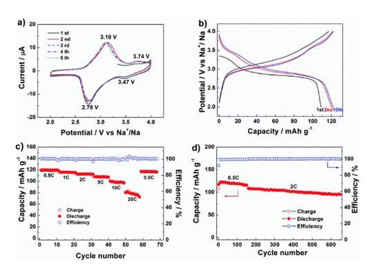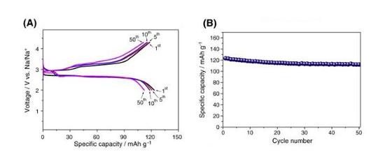 FeFe(CN)6单晶纳米颗粒表现出优异的钠存储性能,可逆容量120 mAh g?1 ,库伦效率约为100%。20C时,仍然具有良好的倍率性能,500个周期后容量保持率达87%,具有优异的循环稳定性,可以成为一种低成本、无污染的钠离子电池正极材料。