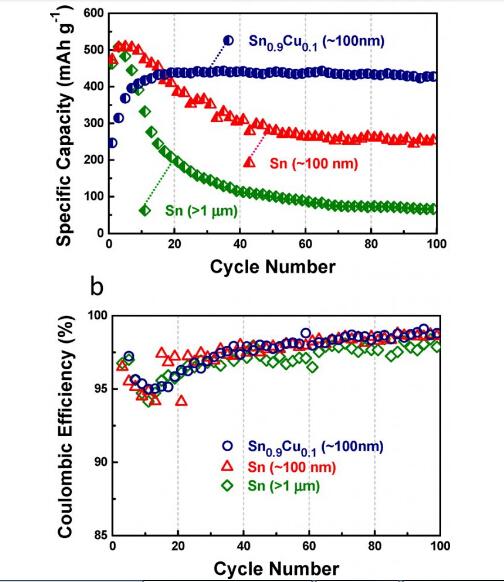 图六 在0.2C(169mA g-1)循环时,Sn0.9Cu0.1纳米颗粒、Sn纳米颗粒、Sn微粒电极的放电容量(a)和库伦效率(b)图