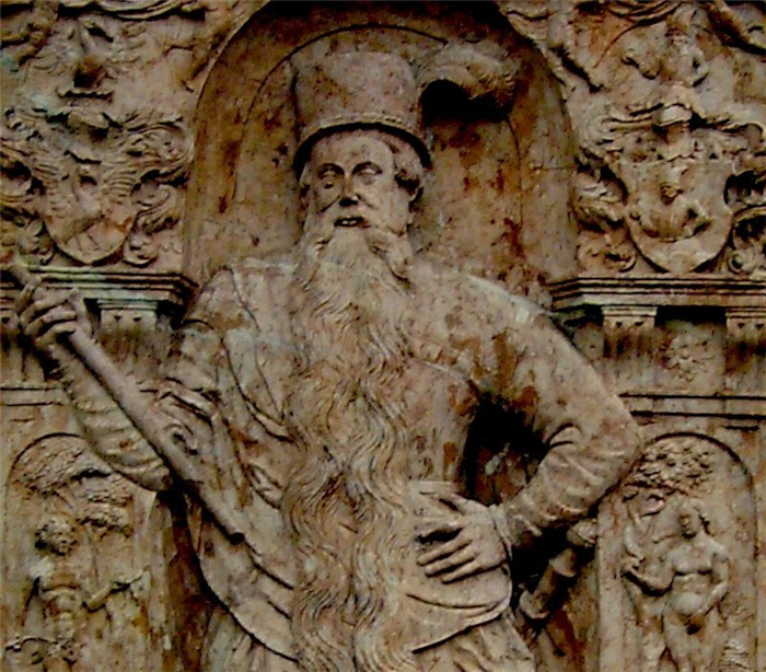 他名叫汉斯 (Hans Steininger),曾是布劳瑙镇长,据说他的胡子真的长过脚,约达2米,几乎成了“第三只脚”。汉斯生前是位人气王,担任当地好几任镇长,直到1567年9月28日。当时镇上发生大火,汉斯平时习惯将壮观的胡子卷起来放进口袋,但那天一阵混乱中,他匆忙救火的路上,奔下楼梯时不慎踩到晃出来的胡子,就这样被自己的胡子绊到,当场摔断颈,真的是被自己的胡子杀了。