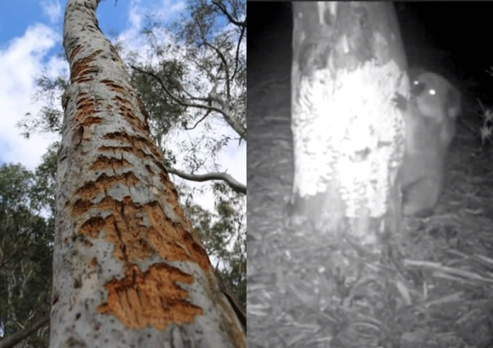 研究人员先在尤加利树上发现咬痕(左图),细查下原来是树熊咬食所致(右图)。