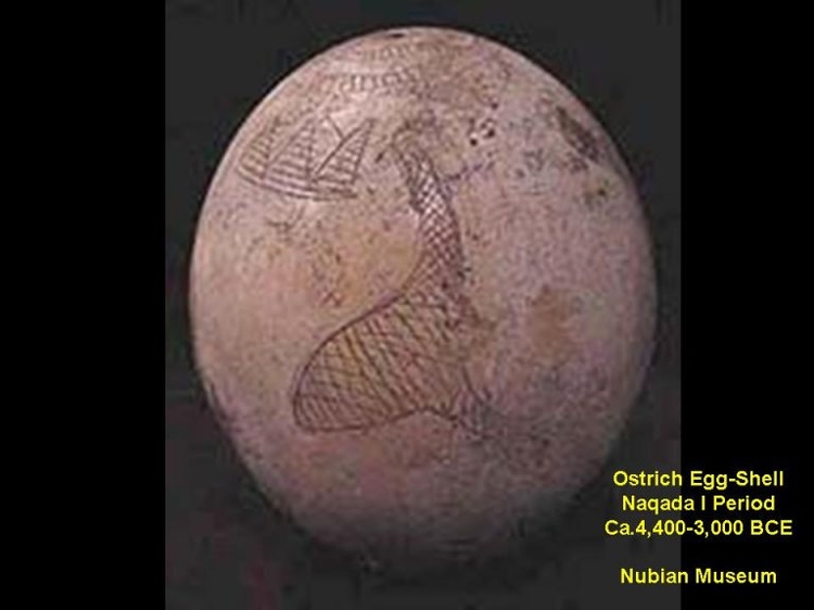 在埃及南部努比亚 (Nubia)博物馆所保存的鸵鸟蛋就已显示了古埃及比我们从历史和考古学所知道的还更古老。这是由英国考古学家马拉比塞西尔·弗斯 (Mallaby Cecil Firth) 在1907年所发现到的。那鸵鸟蛋上有着许多图案,并被存放在墓葬里。在蛋的一边有着植物和鸵鸟的图案,而在另一边则有着吉萨金字塔的图案。