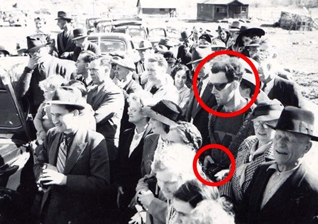 这张照片被展示在布拉诺派厄尼尔博物馆,在1941年拍摄,但图中红圈男子的衣着根本不属于那个时代,你可以看到他穿着现代的拉链连帽衫、T恤,还拿着一台便携式相机,不少人都认为他是时间旅行者。
