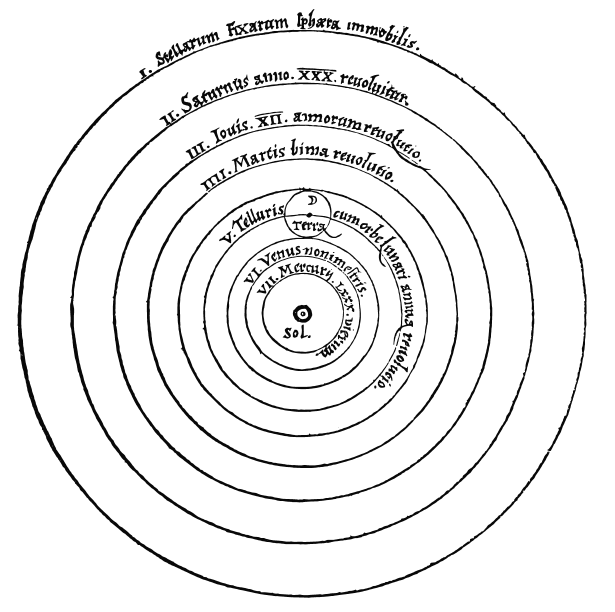 刊于《天体运行论》的太阳系模型(图像来源:维基百科)哥白尼曾根据自己的观测结果,将五大行星与太阳的相对距离算得相当精确。本图仅显示各行星的顺序,轨道大小并未依比例绘制,因此只是示意图。