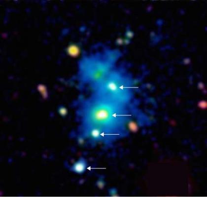 由于具有如此数目巨大的星系,这样的系统也被称为星系团。不过,由于从这一星系团发出的光线经过了100亿年才到达地球,因此天文学家获得的图片显示的是100亿年前的景象,即宇宙大爆炸之后不到40亿年的时间。从这一角度,可以说天文学家观测到了今天的星系团在起源时的场景,这种星系团可以称为古-星系团(proto-cluster)。