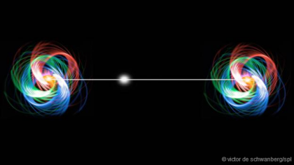 这就是量子纠缠效应——两个粒子尽管在空间上分离,但却诡异地相互联系(“纠缠”)。它们同属于一个单一而不可分的整体,因此对其进行描述的信息无法在它们其中的任何一个粒子身上找到,而在于如鬼魅般将它们两者联系在一起的那种“纠缠”之中。
