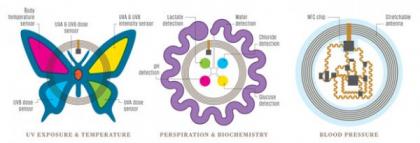 这种生物戳能够像皮肤一样拉伸,内部的电路也是有弹性的,还能够通过无线模式供电。蝴蝶形状的生物戳能够监控紫外线强度,中间的生物戳能够检测汗液中的成分,最右边的生物戳能够检测血压变化。