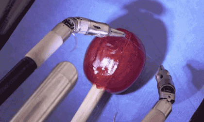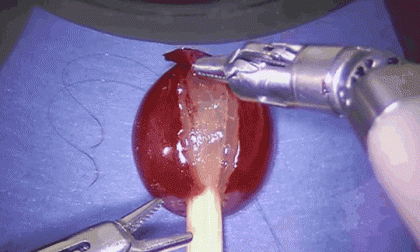 优雅而又稳定的穿针引线,成熟稳健的缝合了新鲜葡萄上开裂的葡萄皮,这不是什么手术室新来的实习医生,而是一台名为达芬奇手术系统的高端远程遥控机器人,下面的一堆动图里,你能看到它对缝合做最后的润色,打结,剪掉多余线头,轻松完成任务。
