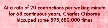 在接下来的68年里,他醒着时候打嗝概率为3秒一次,研究过他的病例的医生估计每天要打嗝24000次,一辈子打嗝打了595,680,000次。