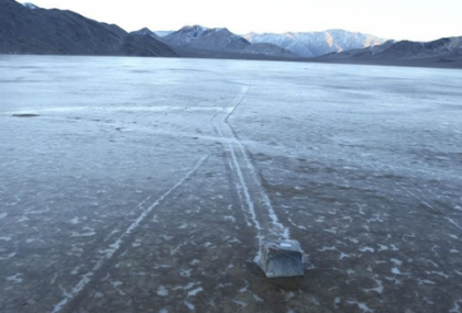 根据《LiveScience》报道,加州大学的研究员理查(Richard Norris) 及詹姆士( James Norris)在2011年时分别在死亡的15块石头上装设GPS,并在附近设置摄影机,经过长期的追踪,发现一切都是因为"沙漠大雨"所造成,雨后积水刚好能淹过石头底部,当夜晚的薄冰随着太阳升起而融化时,坚硬的地面一下子变得光滑,加上风的推进,巨石就会开始"飘移"。